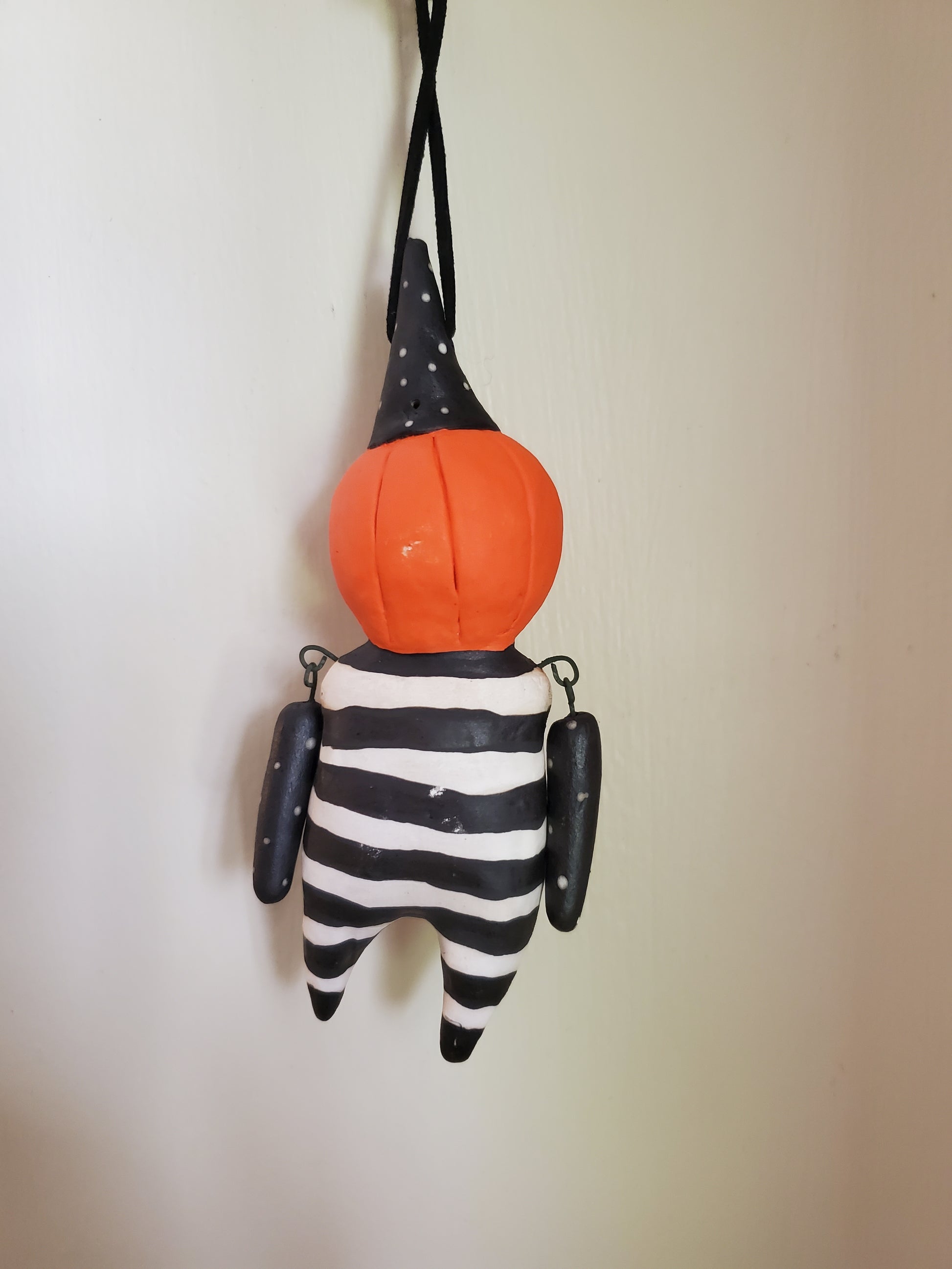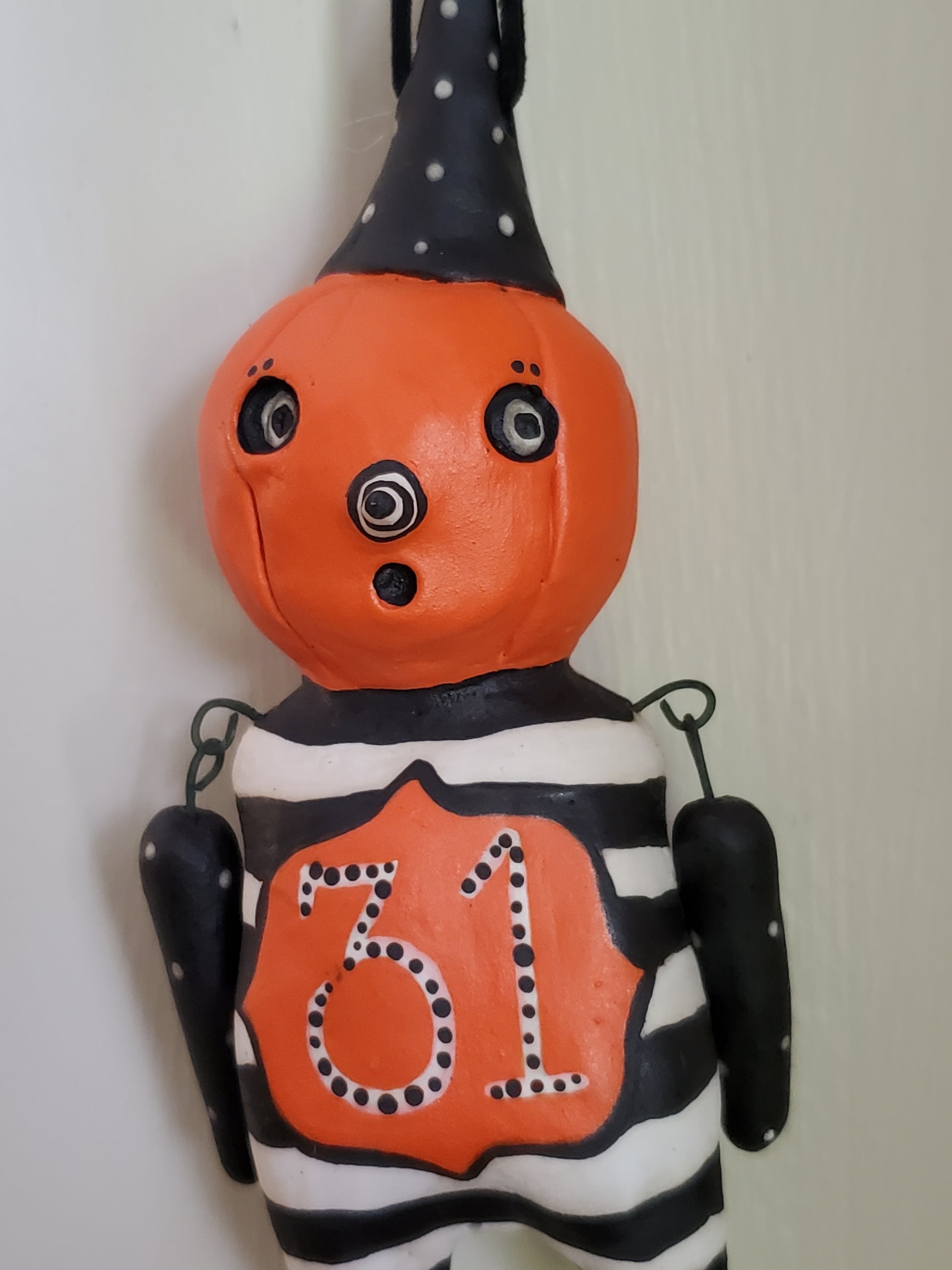 Get ready to celebrate Halloween with Jammie Jackson! This playful Jackolantern loves wearing his "31" jammies and polka dot hat all month long. His adorable charm will bring a spooky cheer to your home decor. Don't miss out on this quirky and fun addition to your Halloween collection!
