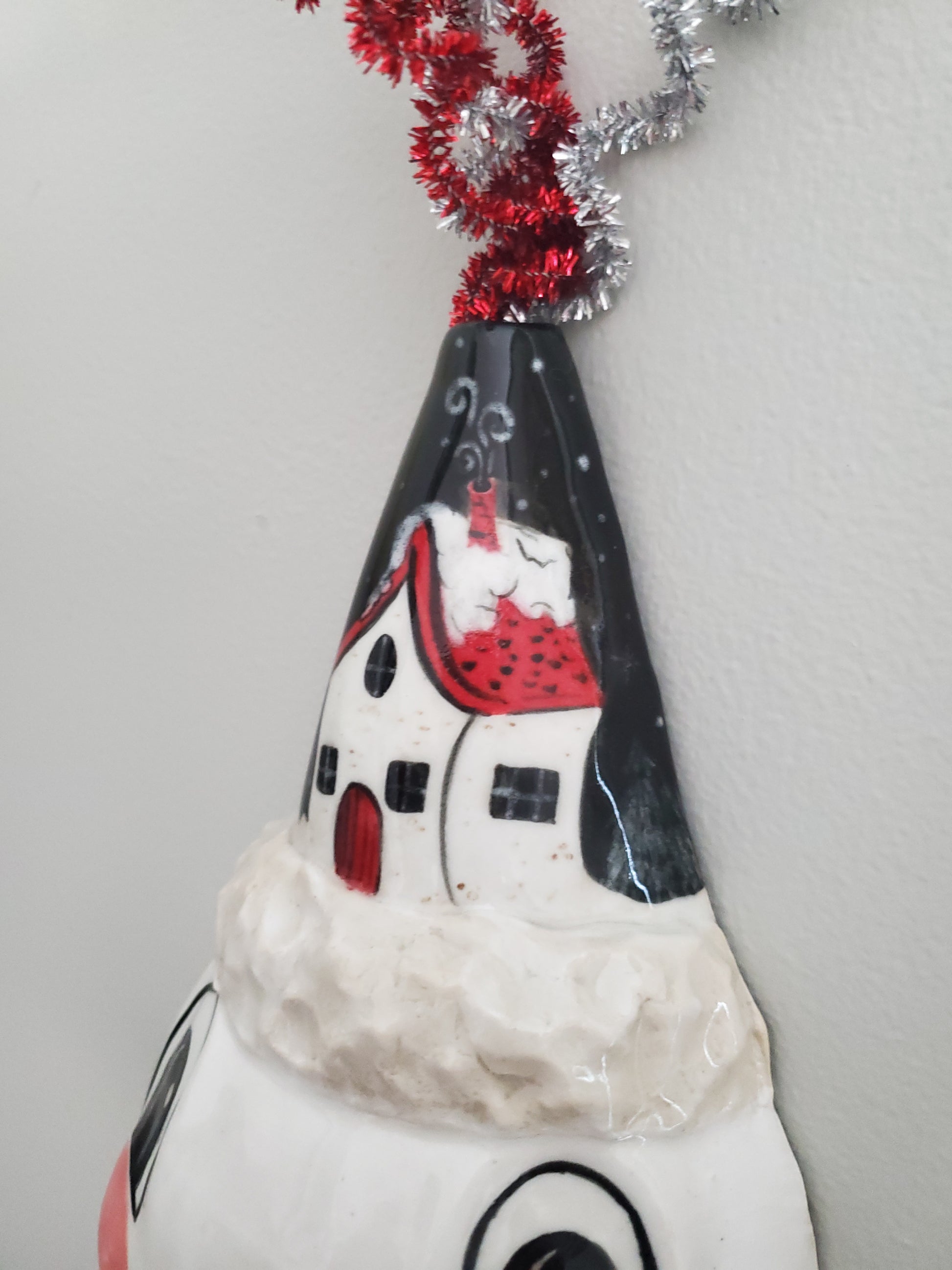 This Johanna Parker inspired Snowman wall vase decor combines playful design with functionality. The striped nose, rosy cheeks, and festive party hat featuring a snow-covered cottage add a whimsical touch to any space. Ideal for displaying seasonal flowers, it enhances holiday ambiance while serving as an engaging decorative piece.