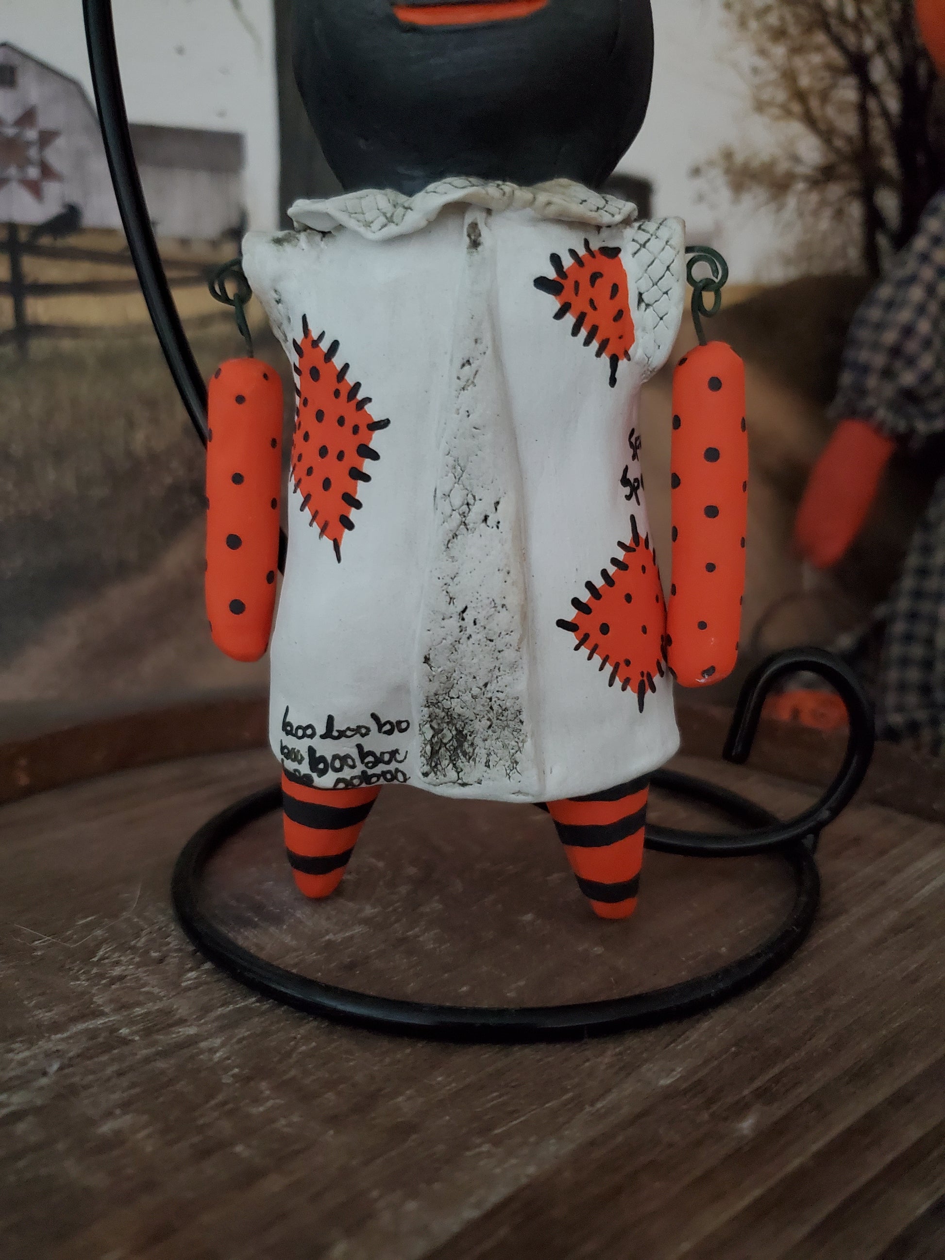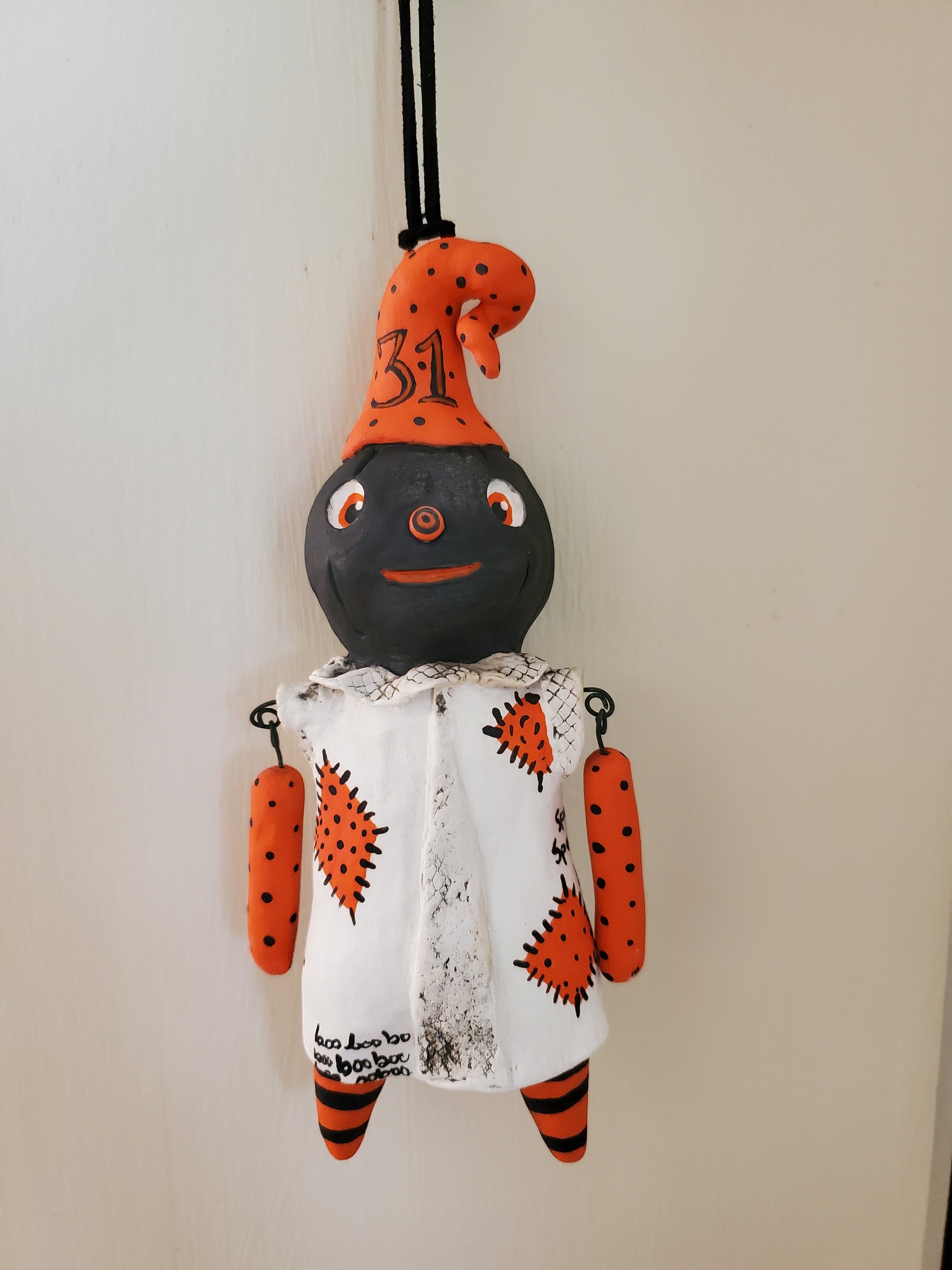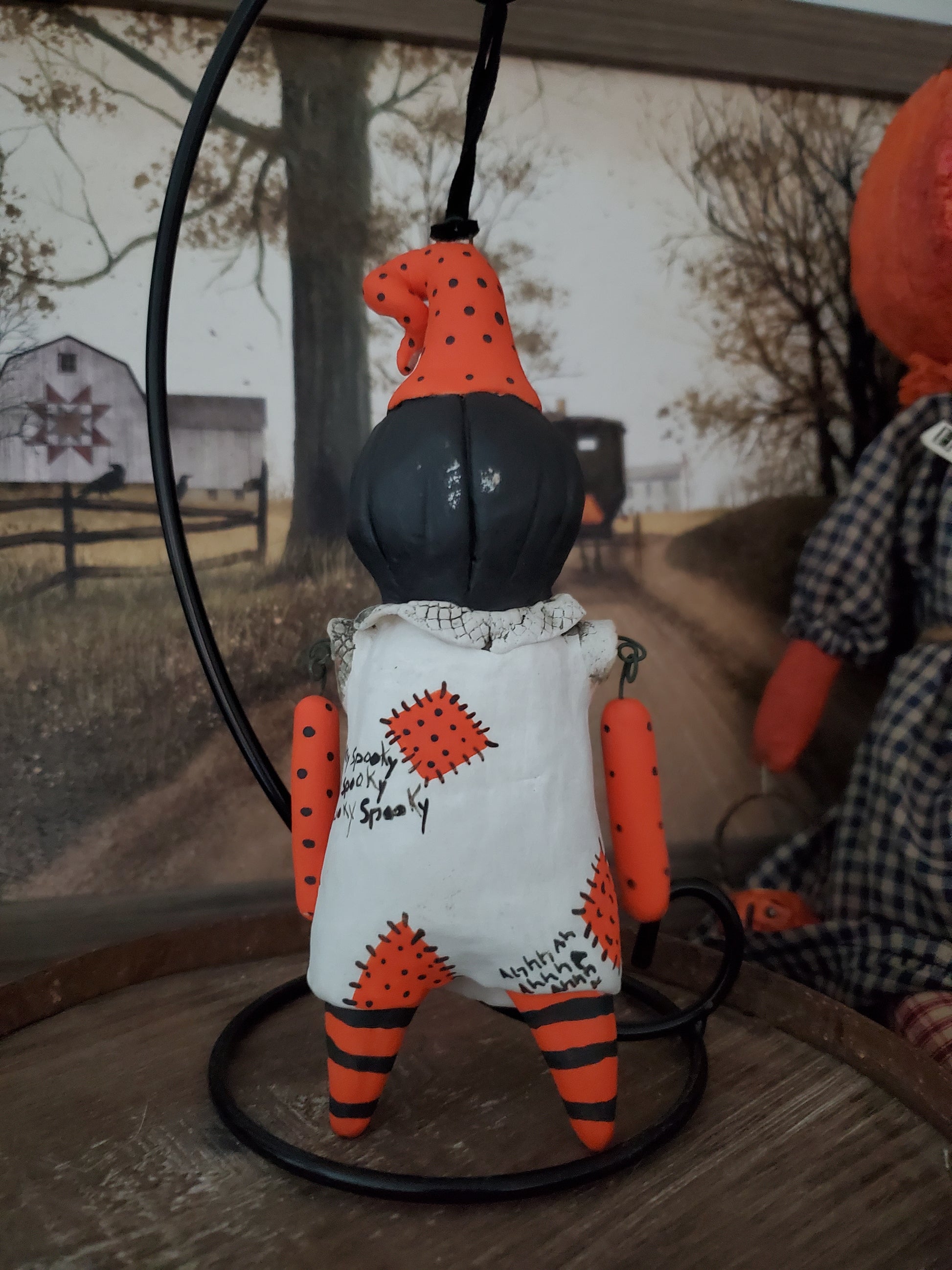 Enhance your Halloween decor with Sabrina Patch. This festive hanging wall decor features a whimsical face and playful smile, complemented by a pretty dress, striped legs, polka dot arms, and a 31 hat. Perfect for Halloween display, this Jackolantern adds a touch of fun and charm to any space.