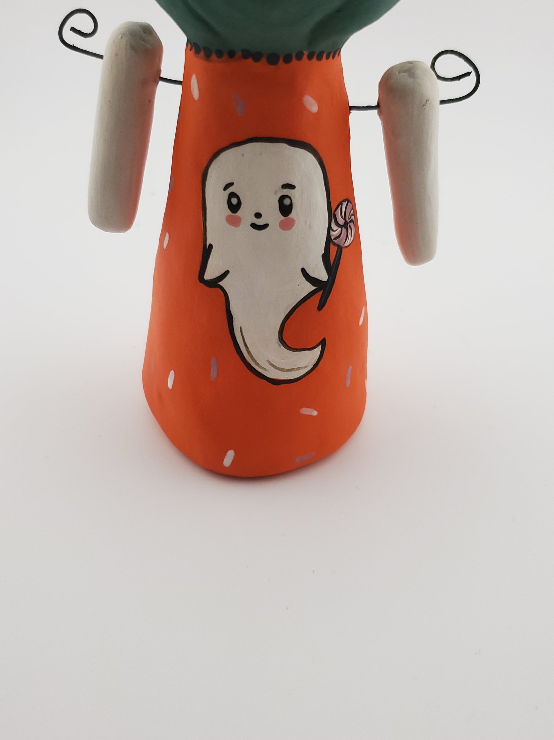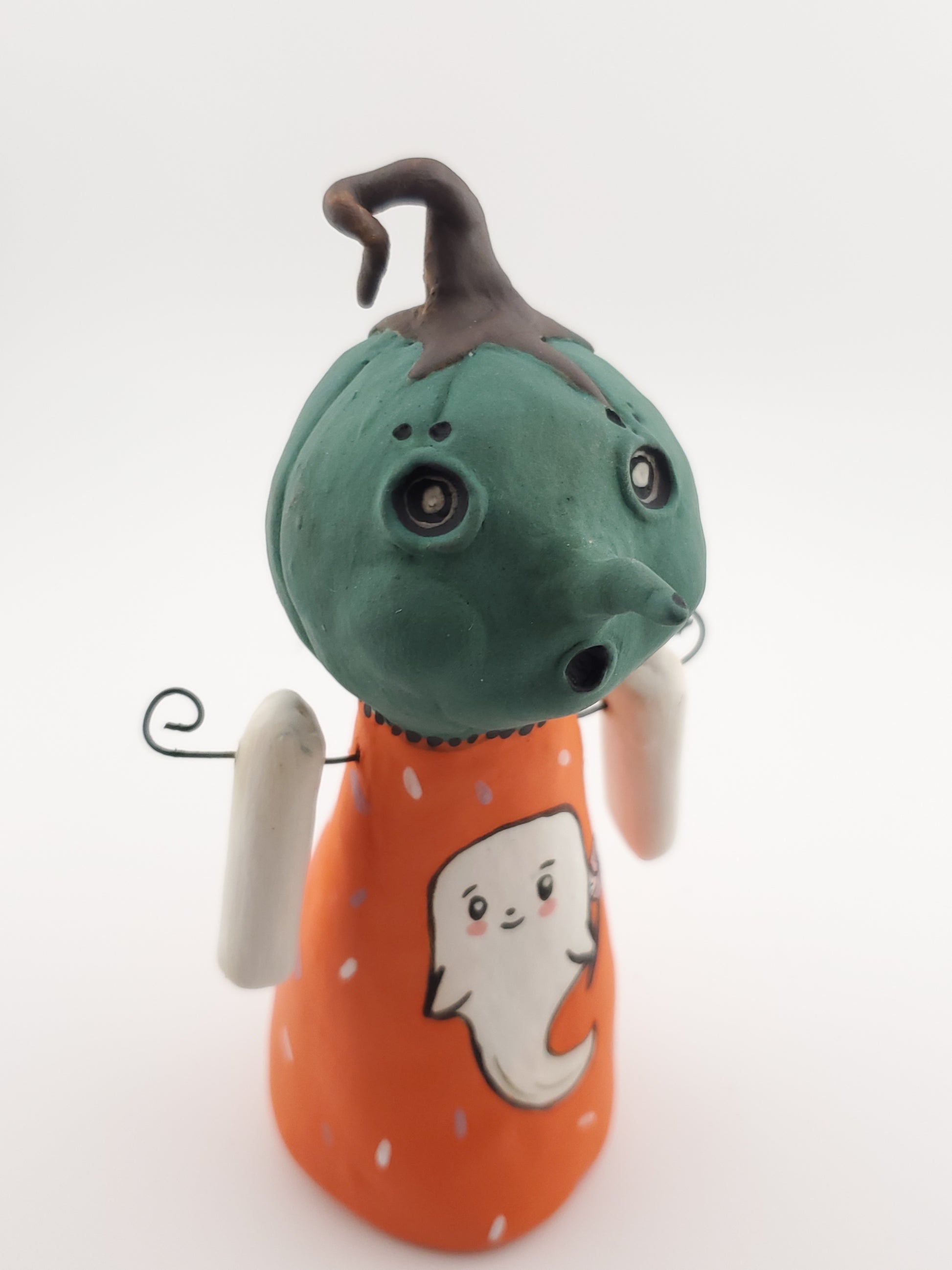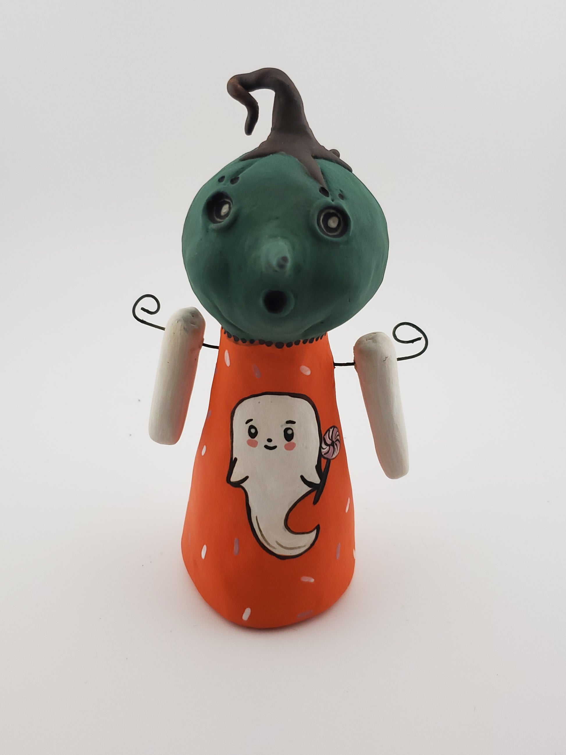 Get into the spooky spirit with my Witchy Green Jackolina. This little figure features rich teal green and bright orange colors, a sweet little ghost, along with a witchy nose and black mole for added charm. Perfect for Halloween displays, this quirky and playful addition is sure to bring some magic to your holiday season.